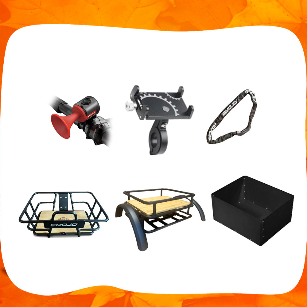 1*horn, 1*phone holder, 1*chain lock, 1*front basket, 1*rear basket, 1*metal box